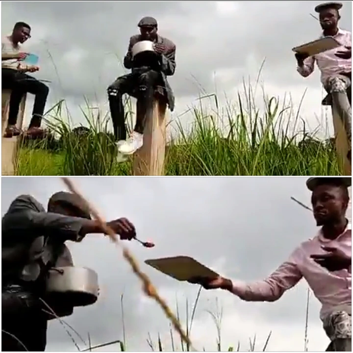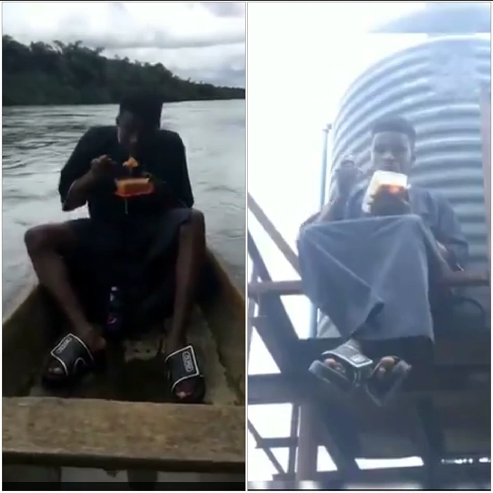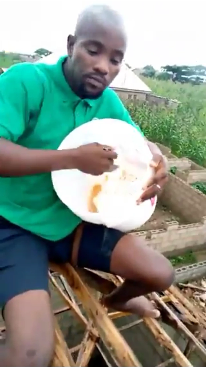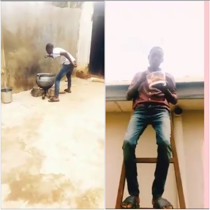 This young man chose to eat his own jollof rice directly from the hot pot without a spoon before climbing on top of a ladder to continue his meal.