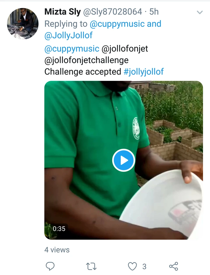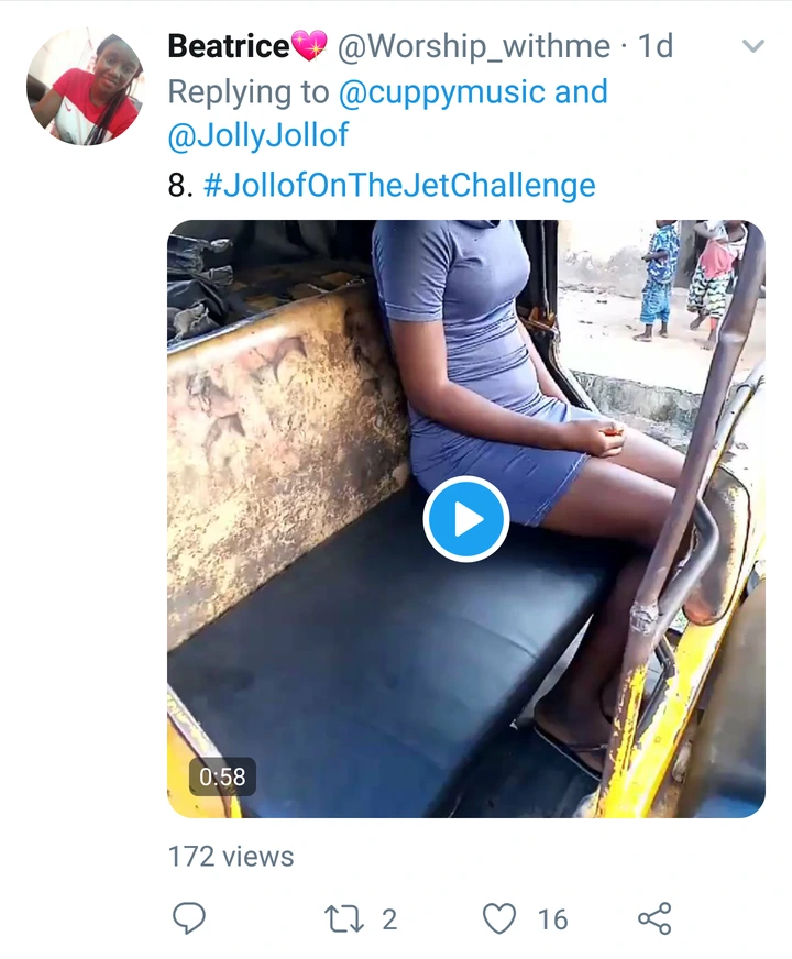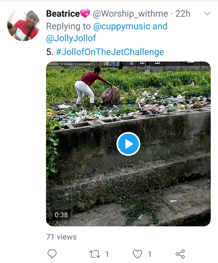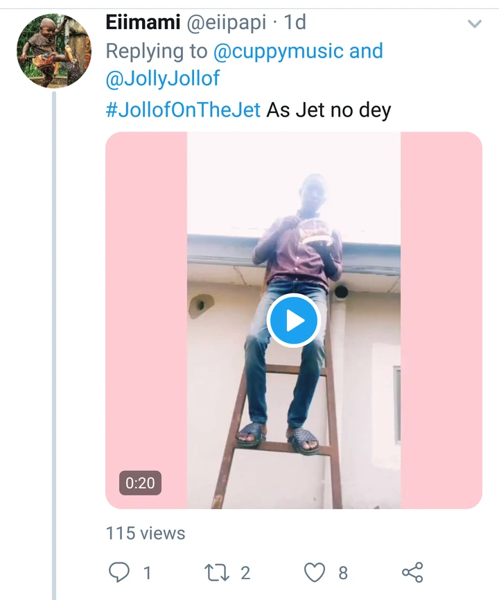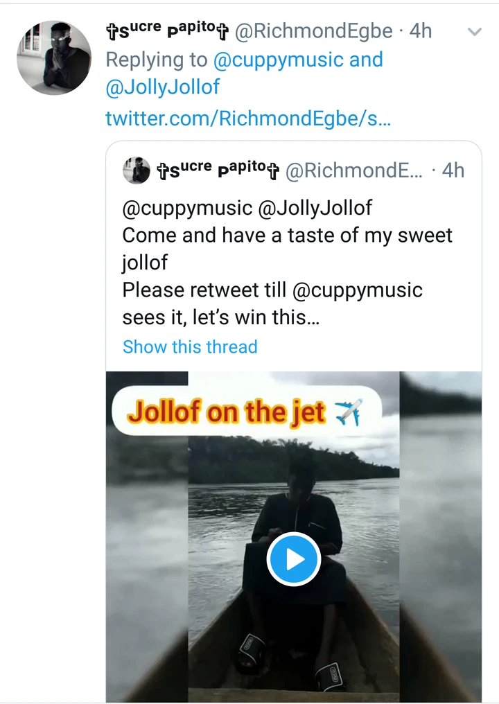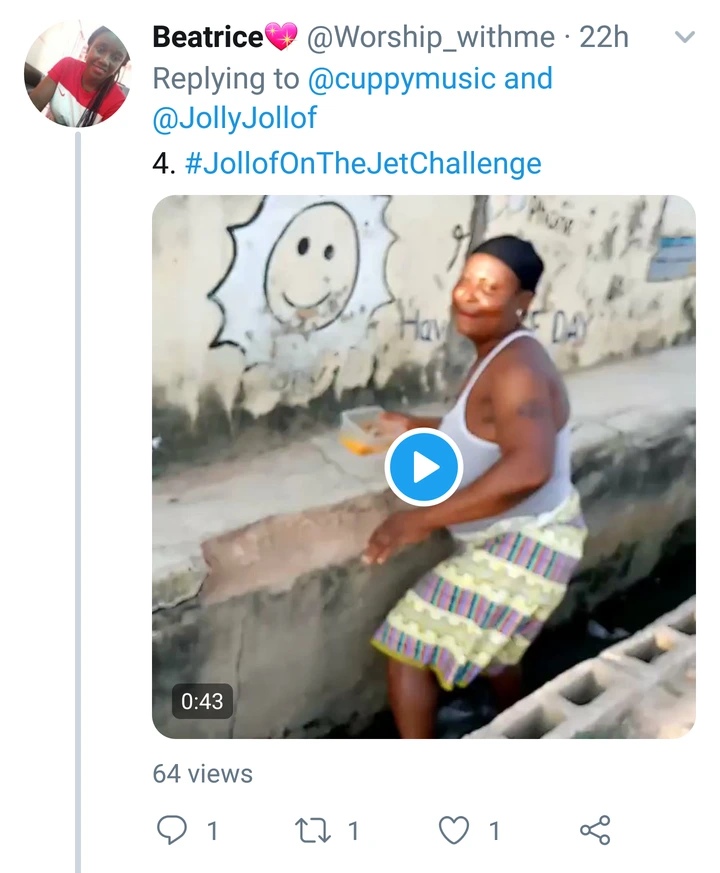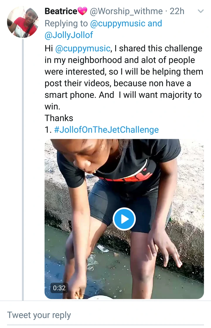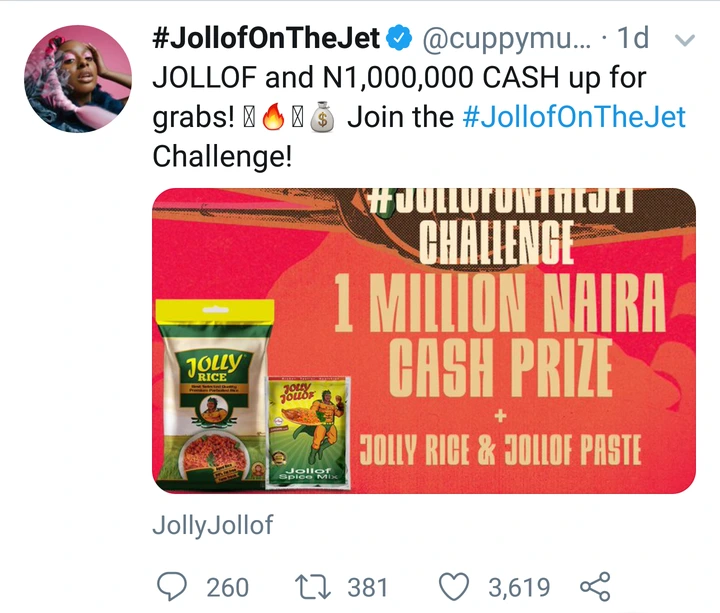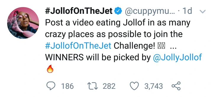 To have a chance of winning, all people have to do is to post a video of them eating Jollof rice in as many crazy places as possible on her twitter account @cuppymusic and @JolloyJollof using #JollofOnTheJet hashtag.