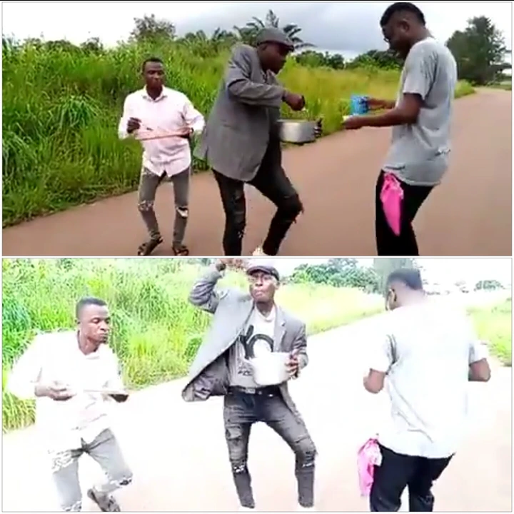 These three young men are dancing on the road while enjoying their pot of Jollof rice.