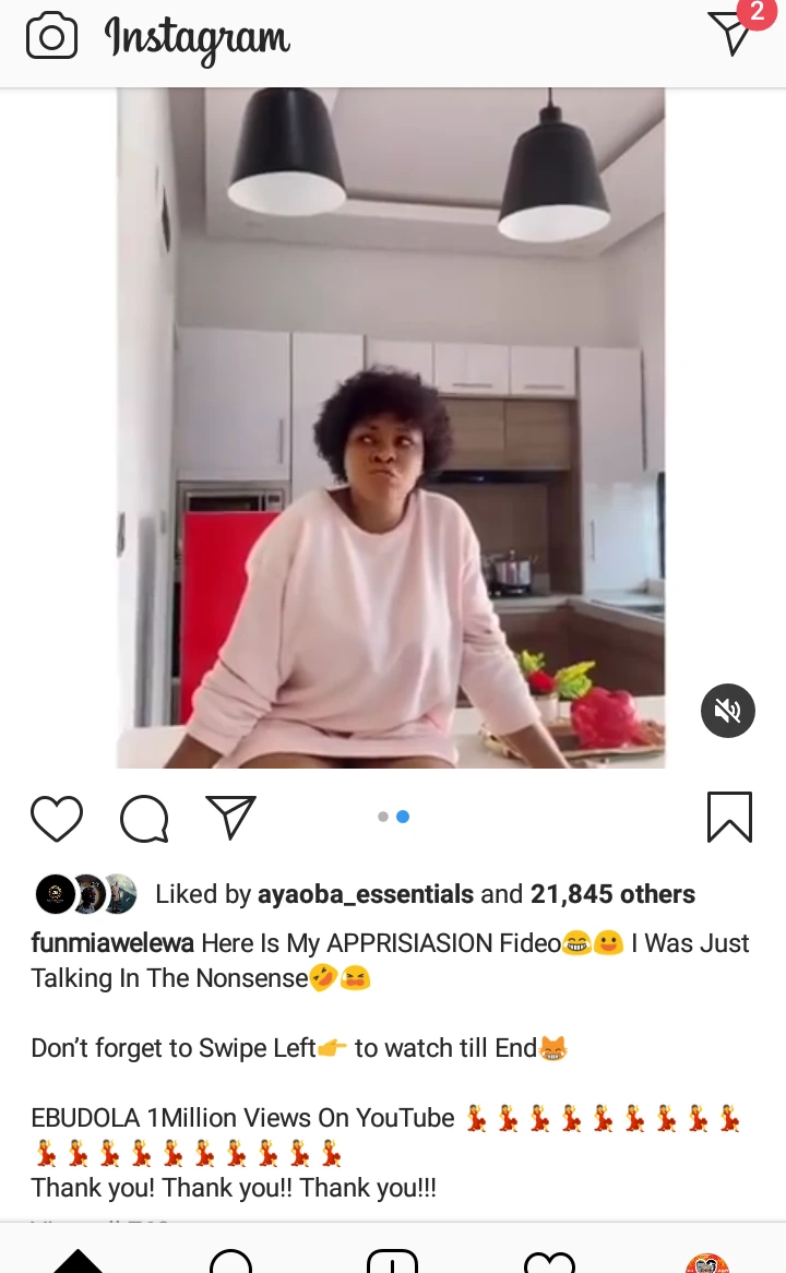 Star Yoruba Nollywood Movie Actress, Funmi Awelewa took to her instagram page to share a goodnews and appreciation message as her new released movie titled "EBUDOLA" reaches 1 million views on YouTube