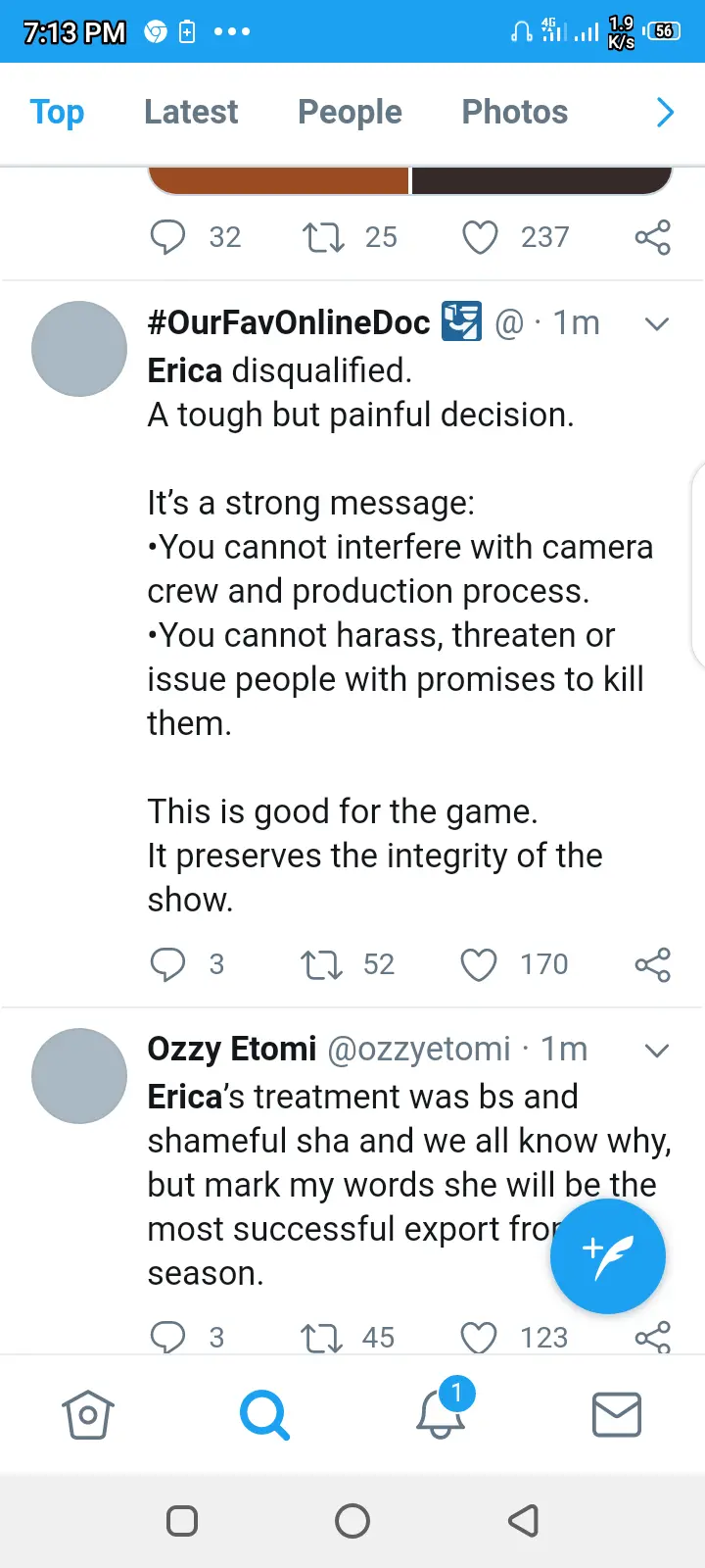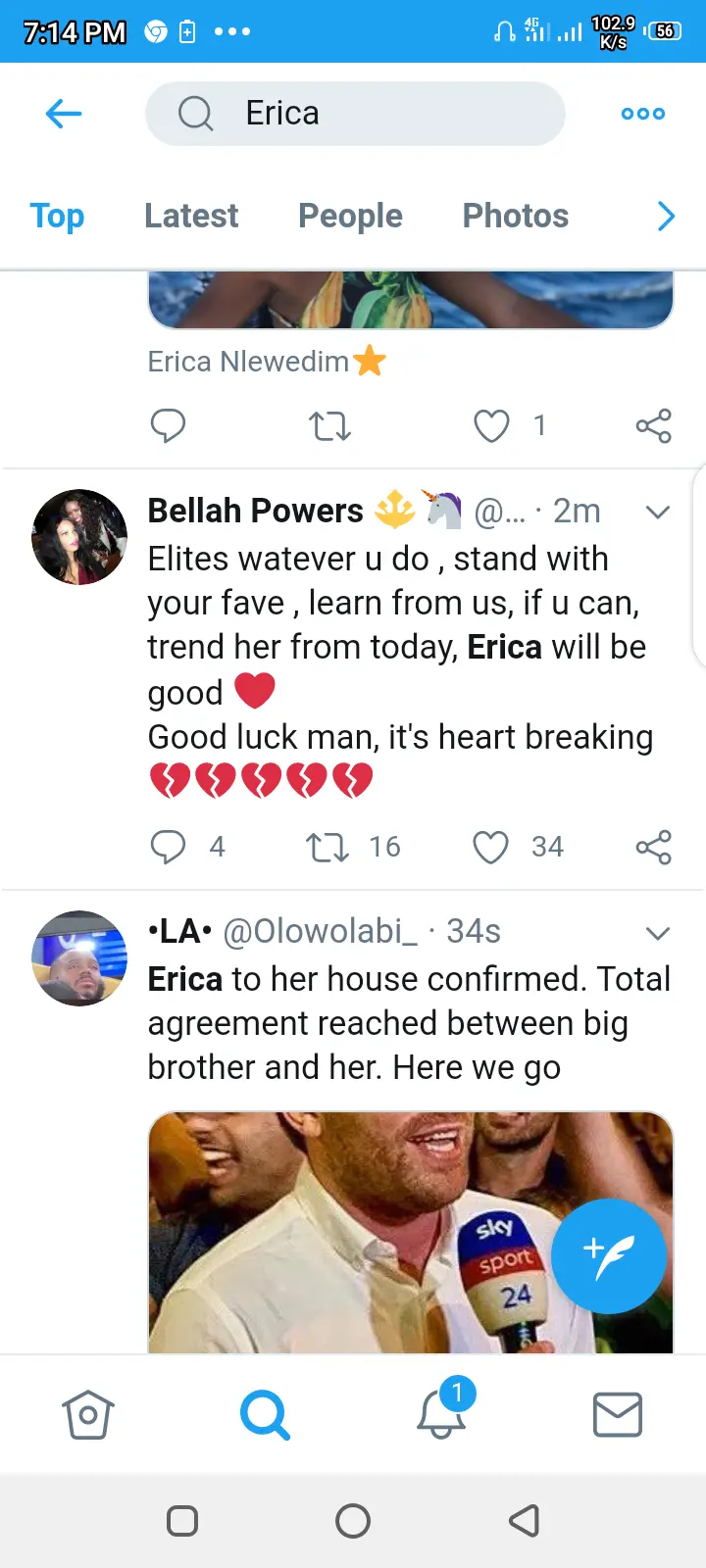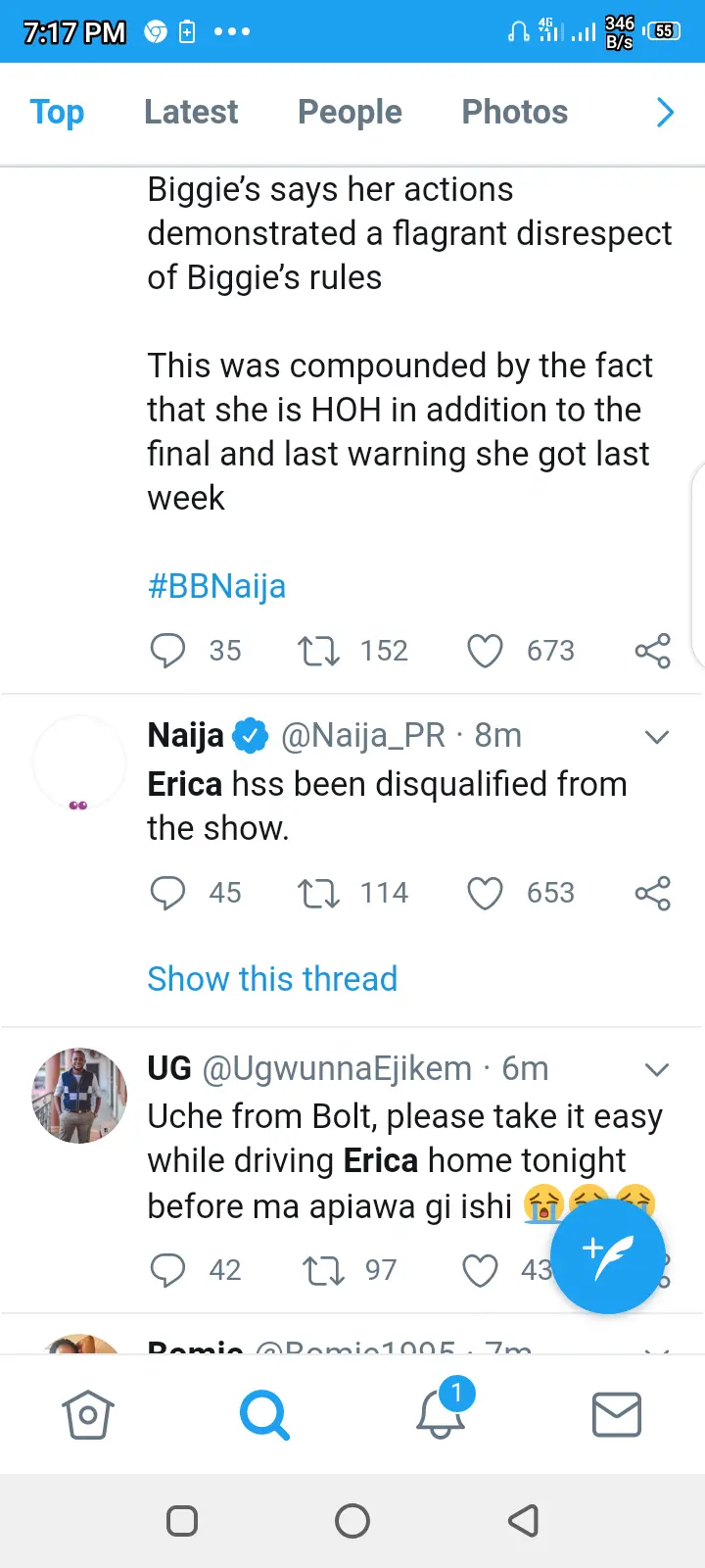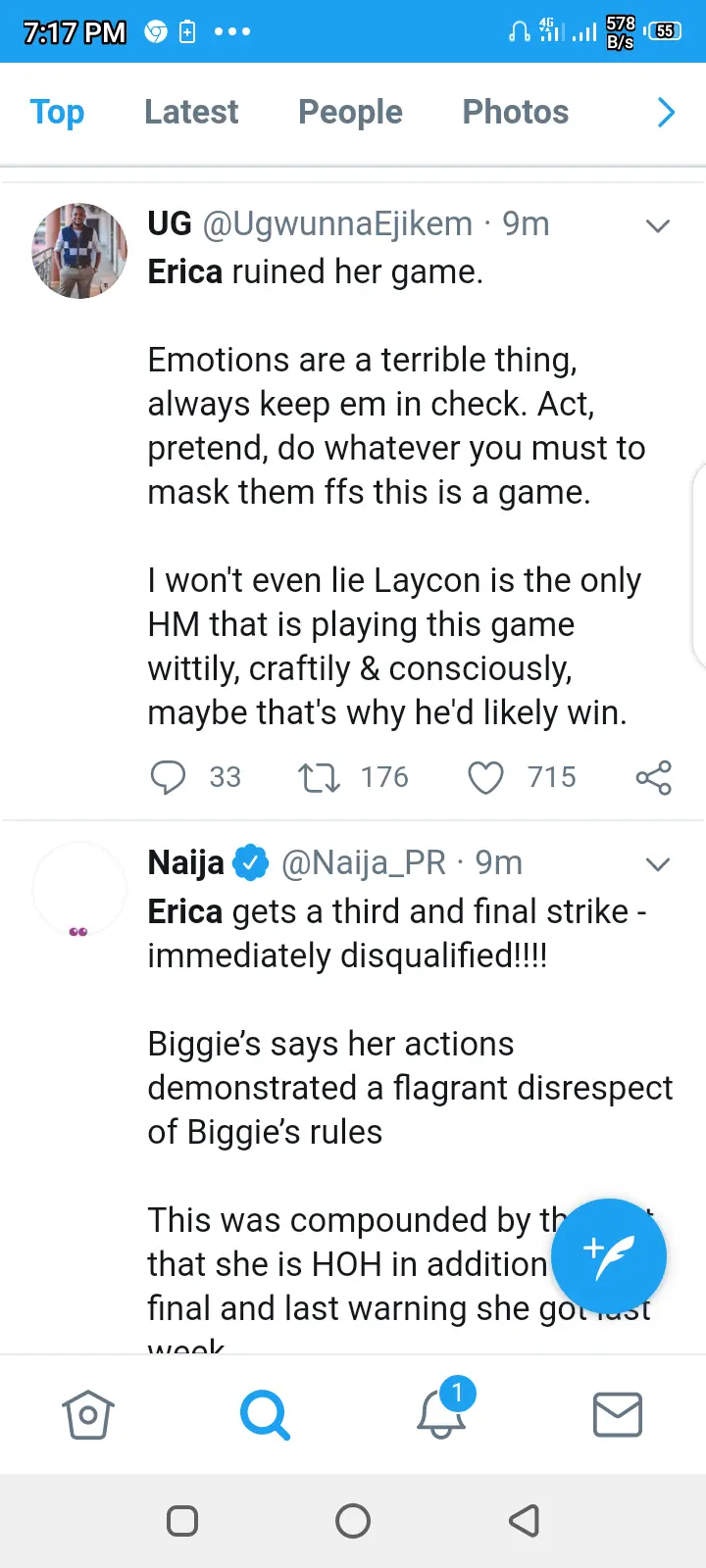Erica has faced what she brought upon herself as a result of her disrespect for the Big Brother's rules and regulations and has hereby gotten a third strike which means that she must leave the house immediately. While Big Brother called upon Erica to tell her the offence she committed, he told her that hee actions demonstrated a flagrant disrespect of Biggie's rules. This means that she has kept dead ears even after the warnings and strikes