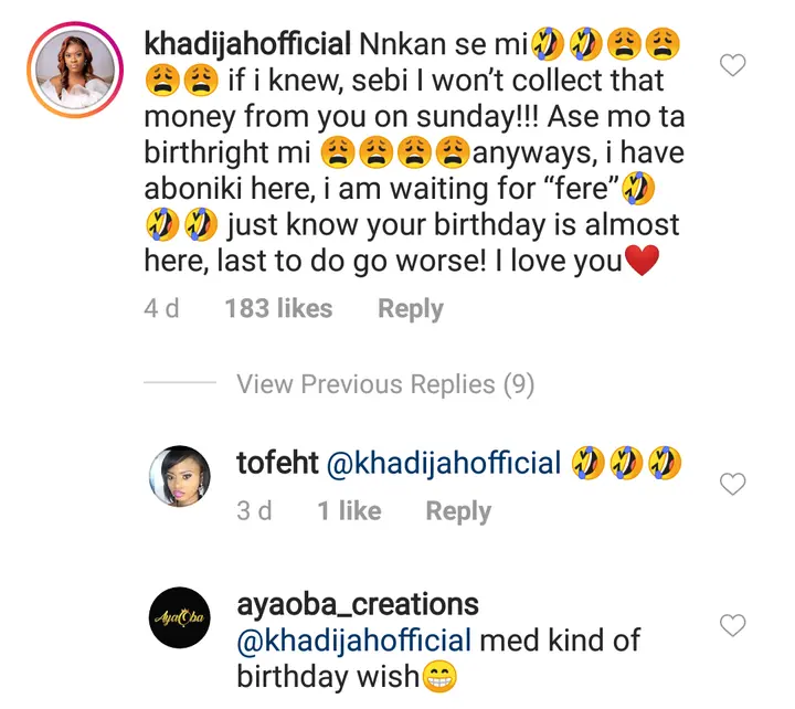 @khadijahofficial-" Nnkan se mi 😂😂 if I knew shebi I won't collect that money from you on Sunday!!! Ase mo ta birthright mi 😩😩 anyway, I have aboniki here, I am waiting for fere 😂 just know your birthday is almost here, last to do go worse! I love you" ❤️
