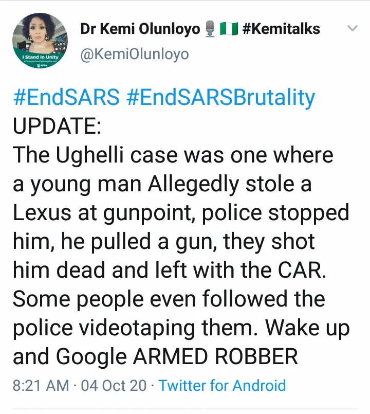The popular Nigerian Journalist Kemi Olunloyo was seen you have reacted to the incident earlier today as she said that the Ughelli guy is an ARMED ROBBER.