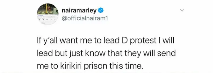"If y’all want me to lead D protest I will lead but just know that they will send me to kirikiri prison this time."